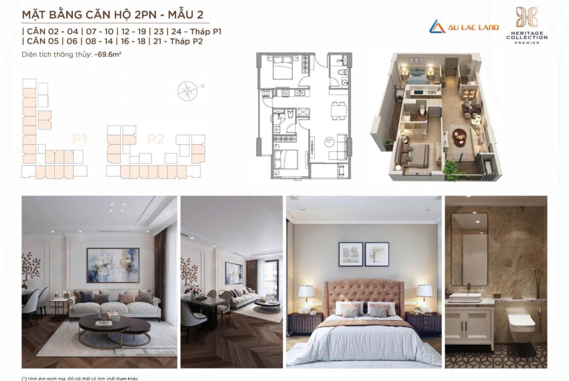 * P1-0614 – 2PN – DT: 69,6m² – Tổng giá bán: 3 tỷ 055 triệu.